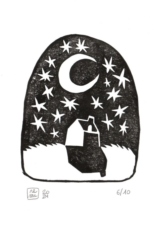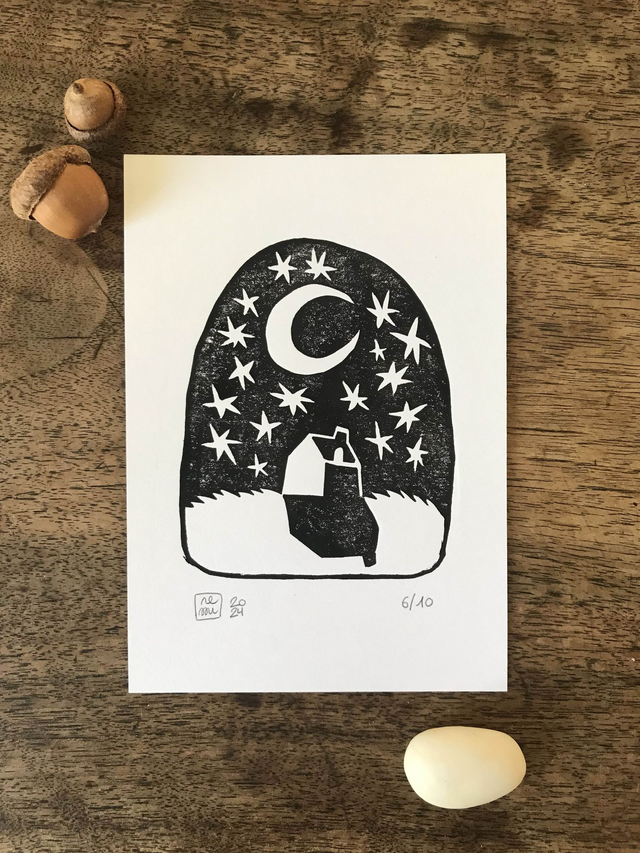 Handmade and hand printed linocut print.