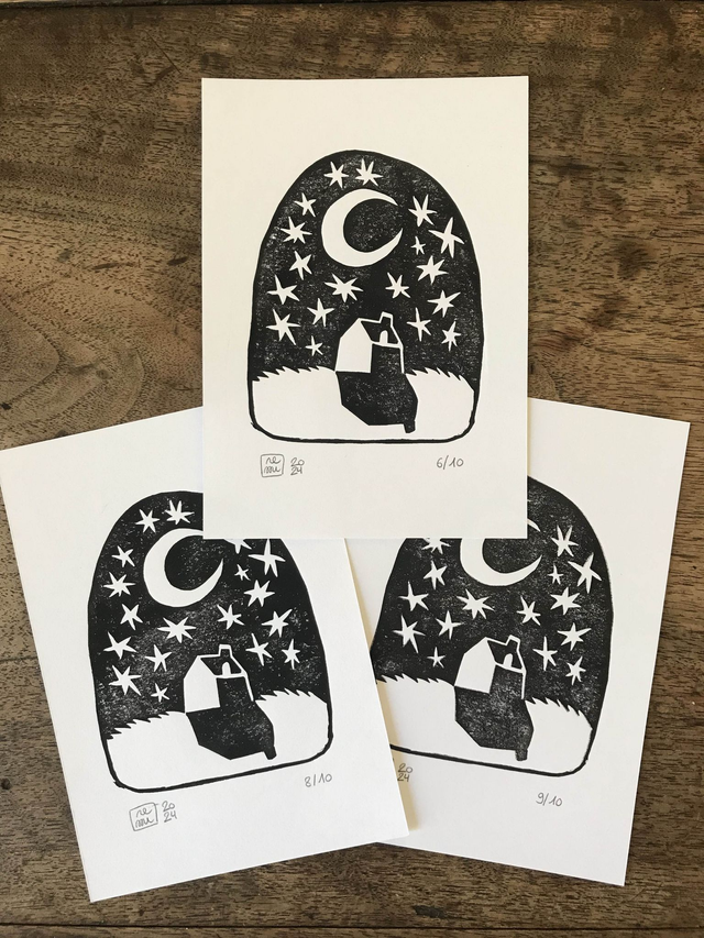 Linogravure réalisée et imprimée à la main.